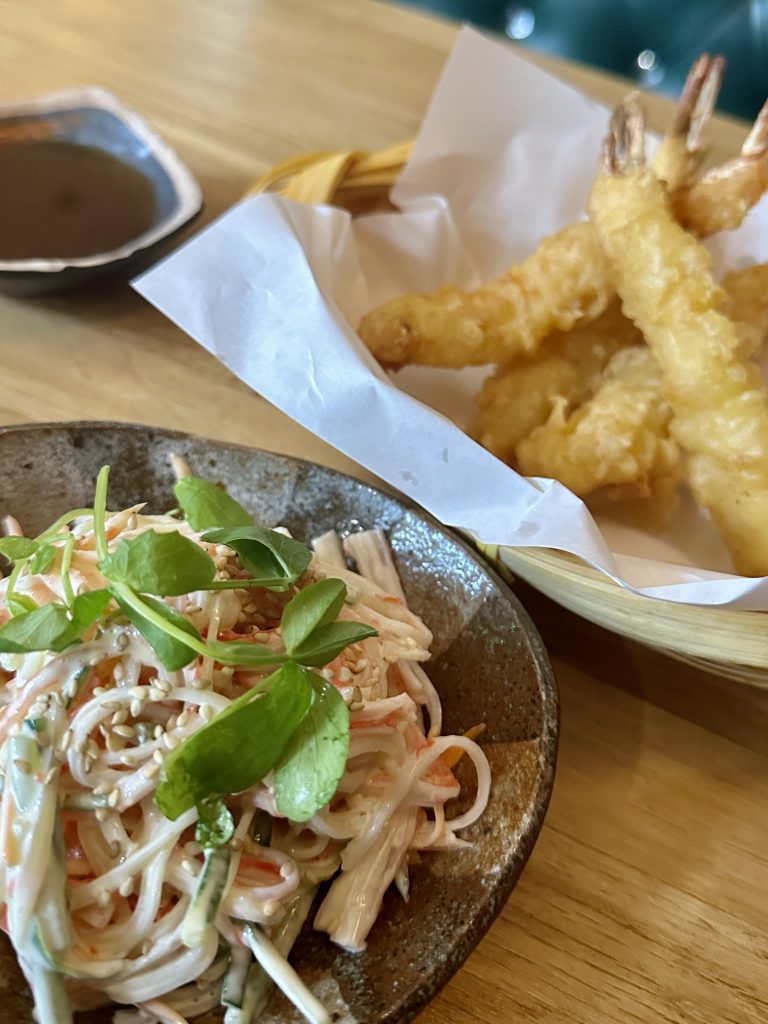 First up was a Kani salad of shredded crabstick dressed in Japanese mayo with ribbons of cucumber and a sesame dressing and arriving at the same time were shrimp tempura that were much more familiar to me. The tempura were well executed with crispy, light batter and an aggressively salty dipping sauce. The salad was new to me with the velvety mayo giving a soft edge to the crab. I’d certainly order this one again.