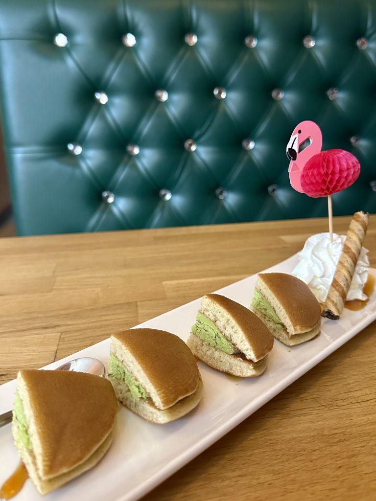 Main course was Unagi Don, an eel and rice dish with a side of kimchi and generous topping of spring onion and sesame seeds. Posting this on my social media provoked a bit of debate about the sustainability of eel so I might order an alternative in future but this was an absolute delight with all the bright and fresh flavour notes I had hoped for. The kimchi was relatively subtle but contrasted nicely with the fermentation coming through well and a nice crunch for extra texture in the dish. At this point I was absolutely stuffed and had forgotten that stuffed pancakes were coming out for dessert….I tried one for the sake of quality control then spirited the remainder into my bag for later indulgence.