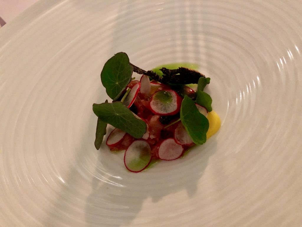 Next up came a rose veal tartare, another open goal in some regards given my preferences, but when viewed objectively, the dish was very well prepared with some radish slices from the kitchen garden cutting into the the rich meat and nasturtium leaves dotted around the edge of the plate.