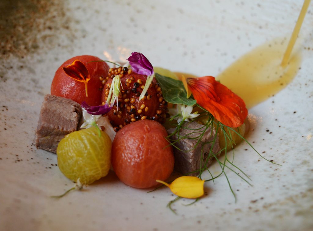 The next dish was again wonderfully executed. Ox tongue with skinned cherry tomatoes and goats curd with a vegetable broth and rose petals. Minimally presented (conventional crockery, should you care) and bursting with flavour, the cubes of meat had a lovely texture.