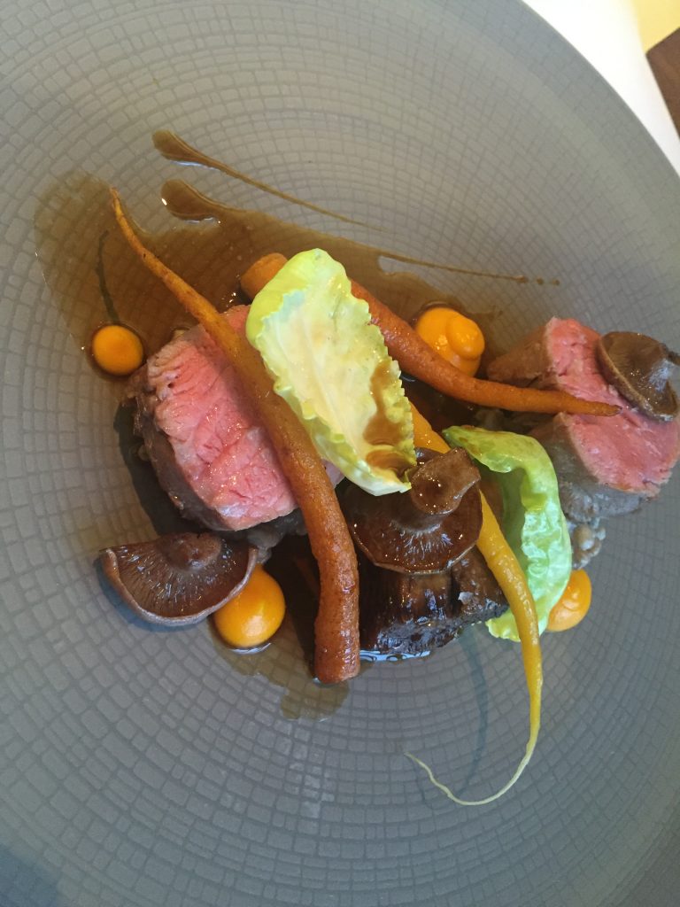 Next to take the stage was seafood in the form of buckwheat-accented langoustine, stone bass, fennel and fennel puree with lobster bisque paired with a superb Riesling. All the elements of the dish came together with the bisque accenting the fish and langoustine wonderfully and the buckwheat giving the plate a neatly contrasting crunch.