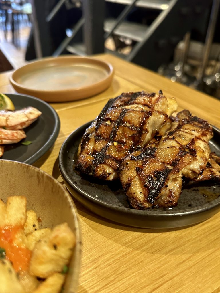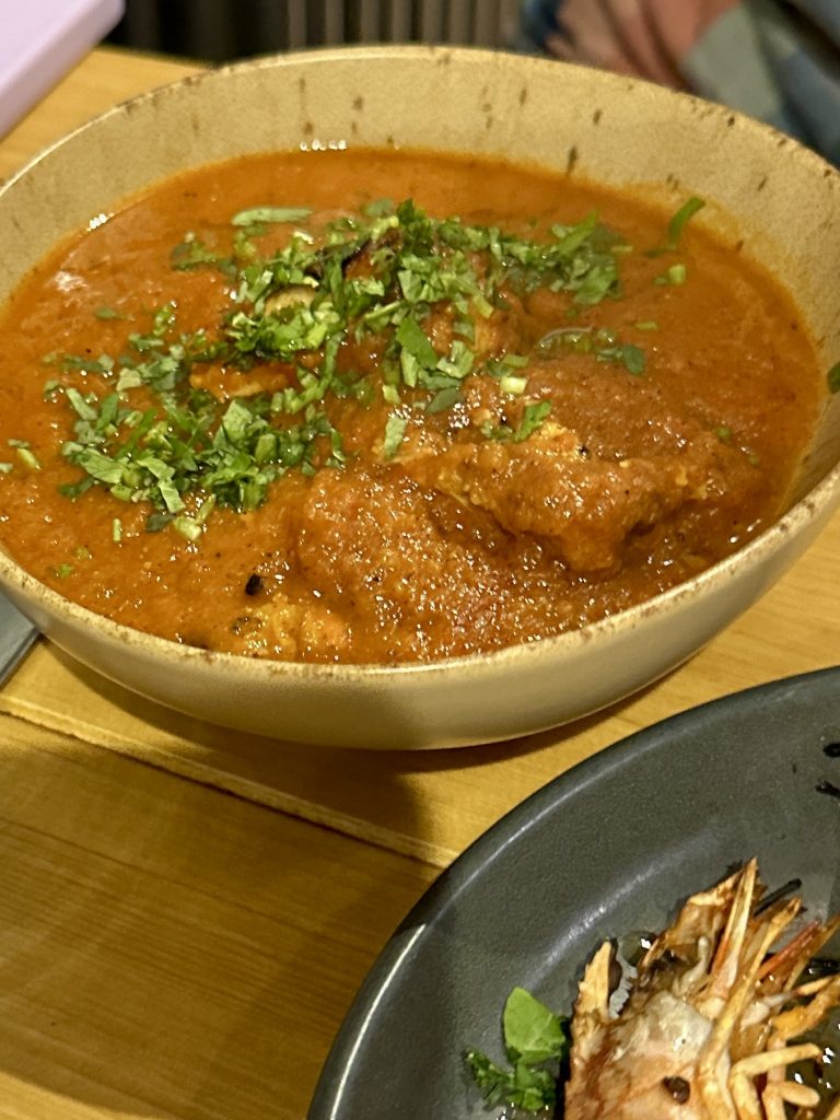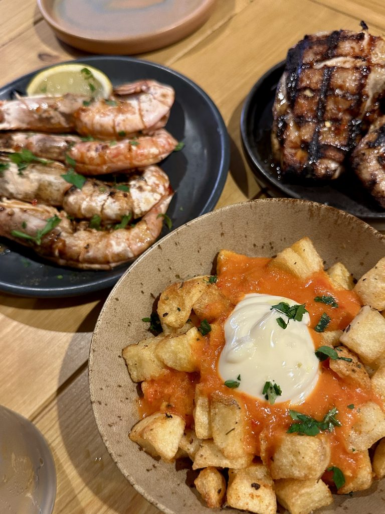 Alongside a portion of the unmissable chicken, we were soon navigating a table full of prawns, patatas bravas, sardines, tomato salad, bread and Goan curry that all looked vibrant and tempting. We got into the prawns first, accepting the messy fingers necessitated by this dish (a finger bowl was automatically provided), which had all the smokiness from the chargrill it needed to balance the sweetness of the prawn that lingered as we cleaned up ready to tackle the other plates. Sardines were served whole with lemon and plenty of fresh herbs scattered over them, all of which helping the flavours come through. It’s too much of a novelty to see sardines on a menu, so on rare occasions such as this it’s a relief to see them done justice. Running alongside this was a beautiful tomato salad with olive oil and just enough seasoning to let the produce sing. Combined with the seasoned, oiled and charred bread, this pairing did a great job of letting the ingredients core qualities show their best.