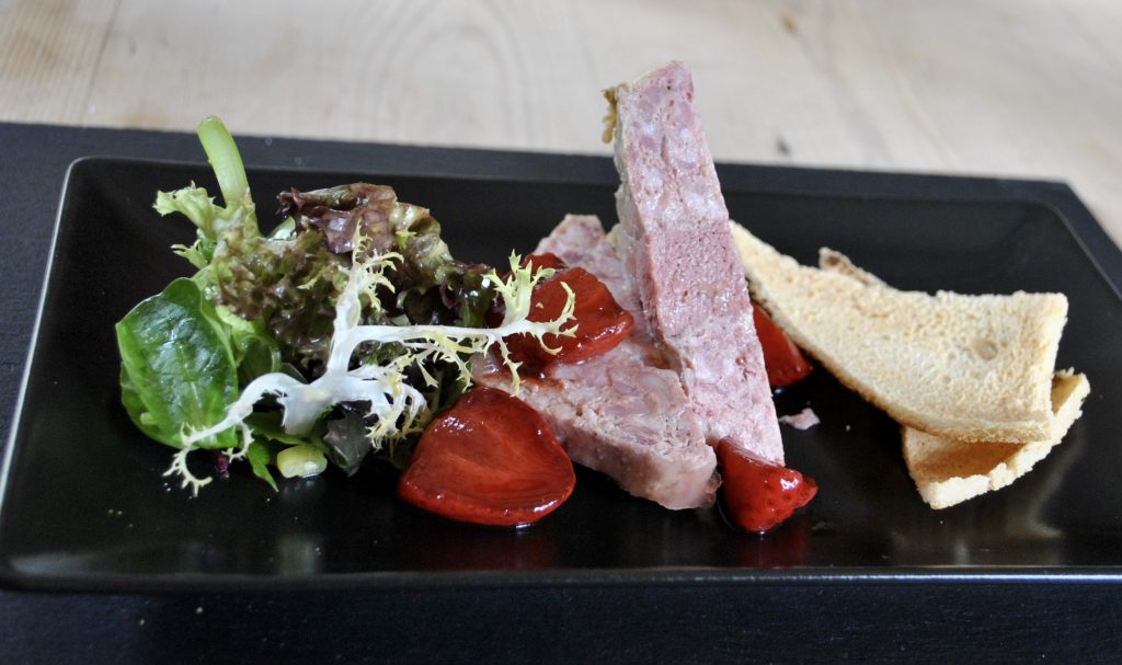 The first courses arrived quickly courtesy of our friendly server and were nicely presented without undue fuss. My terrine wasn’t overloaded with garlic as is often the case and the seasoning was well judged. Strawberries were an unusual accompaniment that I later discovered from the chef had been cooked in a vacuum to get them to the desired texture. Grace spoke very highly of the garlic mushrooms indeed, some more of her thoughts later.