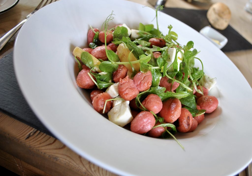 As the focus of the meal shifted to the mains I was curious about how the Yorkshire beetroot would be presented. It turned out to be wonderful and, for me, stole the show. Vivid pink gnocchi, Yorkshire Fettle cheese and golden beetroot sat under pea shoots and combined to a delightfully well balanced dish. Light fluffy gnocchi balls with the sharp golden beetroot and crumbling Fettle paired fantastically. If I was to level any criticism at the plate it would only be that (with half an eye on a review meal coming up in the evening, woe is me) I couldn’t finish it. Worry not though, nothing went to waste as my wife gleefully got stuck into the leftovers later in the day.