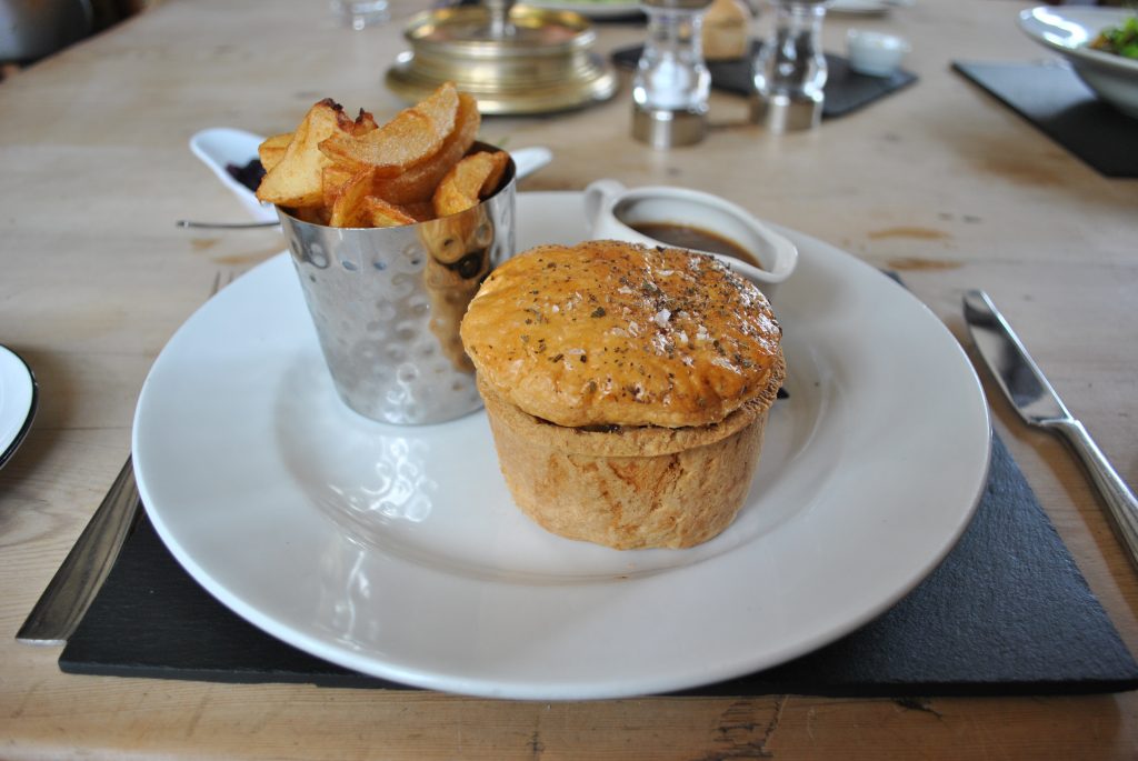 The pie Grace ordered was, again, simply presented: a portion of chips and a small gravy boat accompanying the main event, the details of which I’ll also leave to Grace. As the plate came down my reaction was of surprise to find it an actual pie. Yes that may seem like an odd reaction, but to find all sides of the pie made of pastry rather than just the lid is an increasingly rare sight.