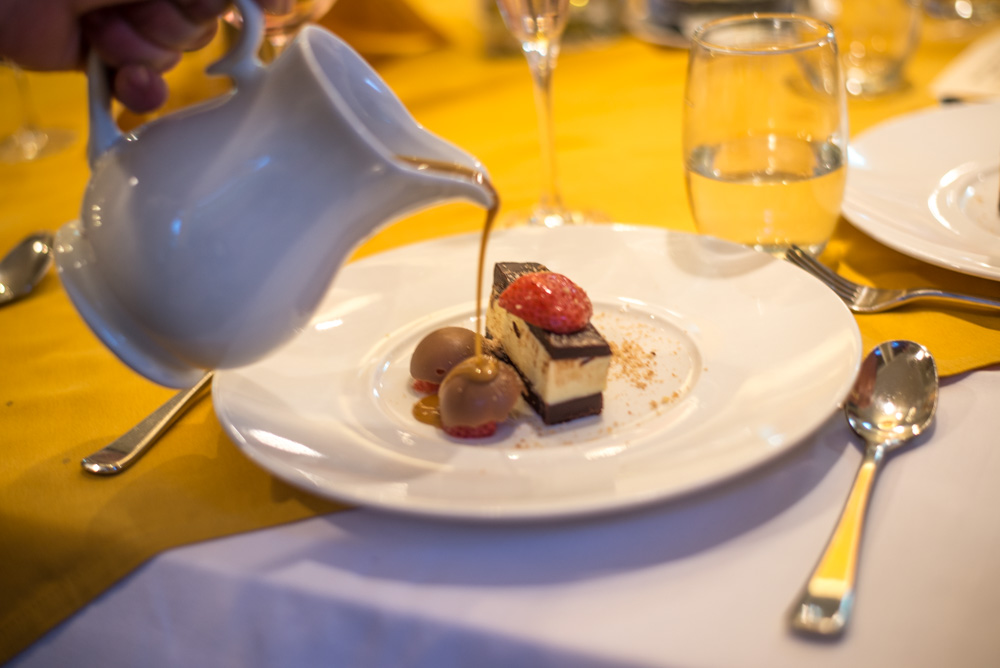 The final course was a dark chocolate torte with white chocolate mousse, salted caramel and sous vide strawberries. Thankfully it wasn’t too rich or too heavy after being a couple of courses to the good. It may be now so unfashionable as to be a major faux pas to serve unsalted caramel, but with good reason, this was a well-balanced end to a well-constructed menu.