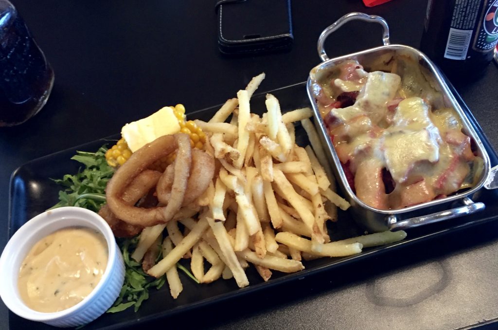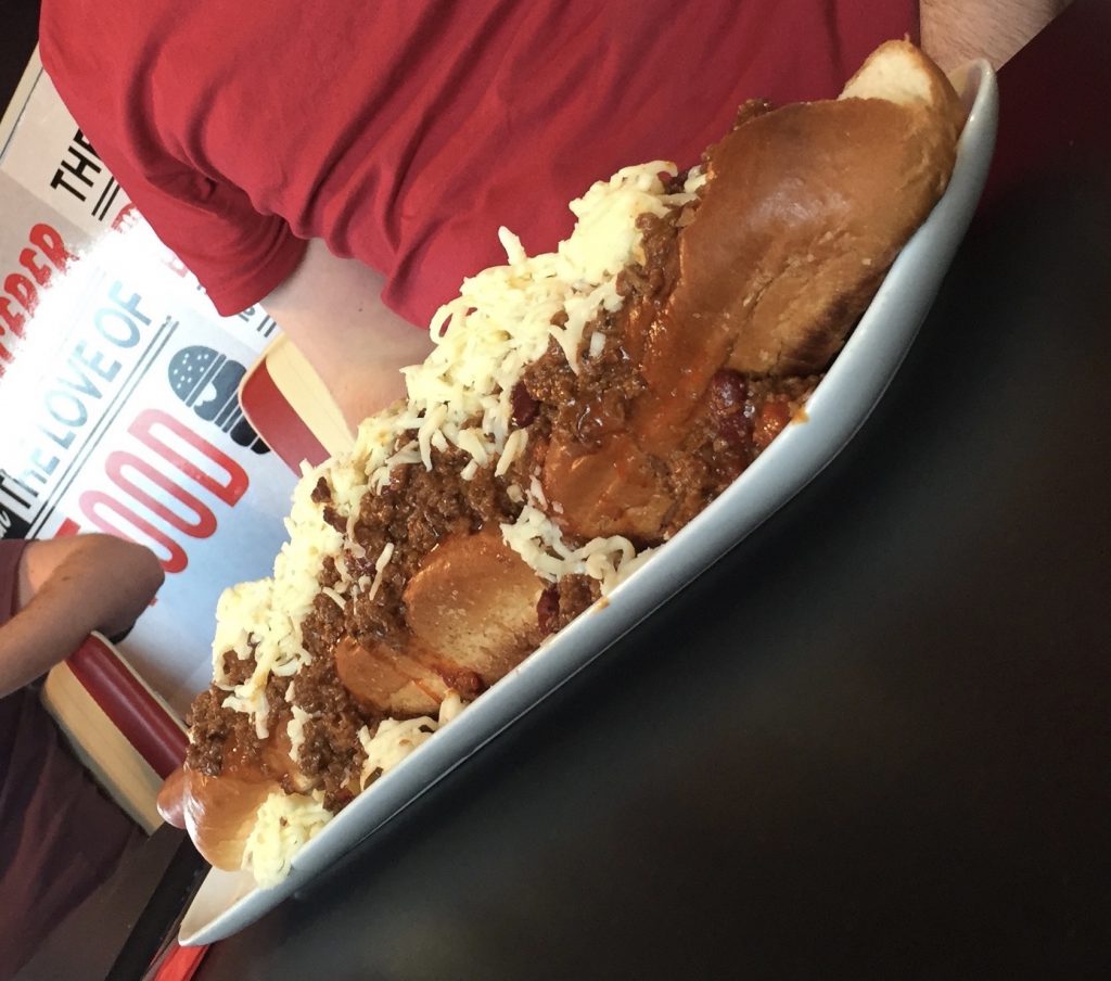 Early discussion around the table centred, after the drink order, on if any of the group would succumb to peer pressure and tackle a food challenge. Thankfully the answer was yes, though it must now be said that the individual in question has requested his identity be omitted (if you’re wondering why the pics are strangely cropped, it’s for the sake of his modesty). The challenge in question was “Man vs Dog”: a pair of hot dogs smothered in chilli and topped with cheese. If that sounds achievable, remember they’re actually two feet long. Each. Four feet of hot dog, could be tricky.
