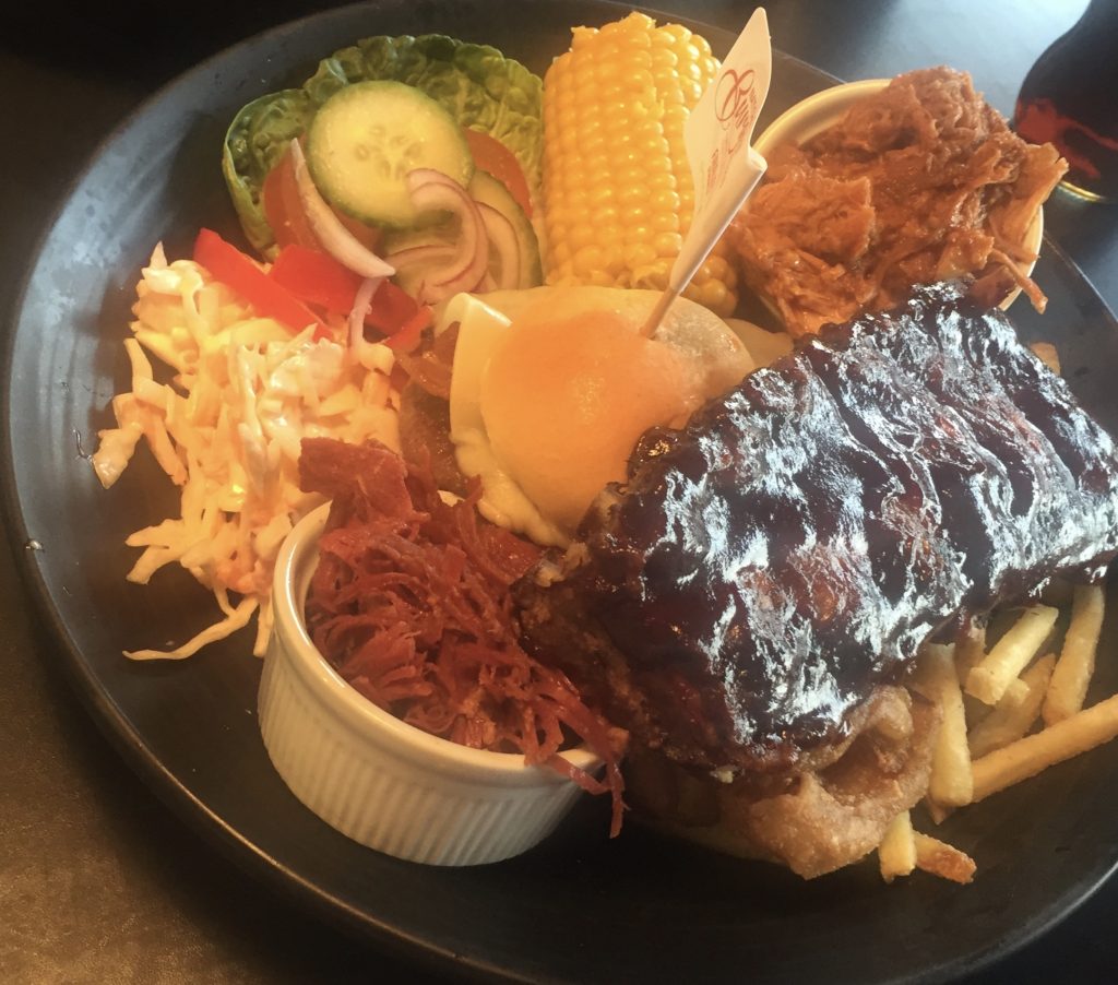 The rest of the table showed more restraint and went for a variety of sliders, platters and meats which started to arrive in fairly short order as we watched our intrepid companion exhibit some nerves at the prospect of what he was about to take on. The whole party agreed that the various cuts of beef and pork reflected long and careful cooking processes with ribs and shredded pork gaining particular praise. Sides of corn, onion rings, fries, coleslaw and salads all hit the spot without being allowed to get in the way of our mission to consume large quantities of various animals.