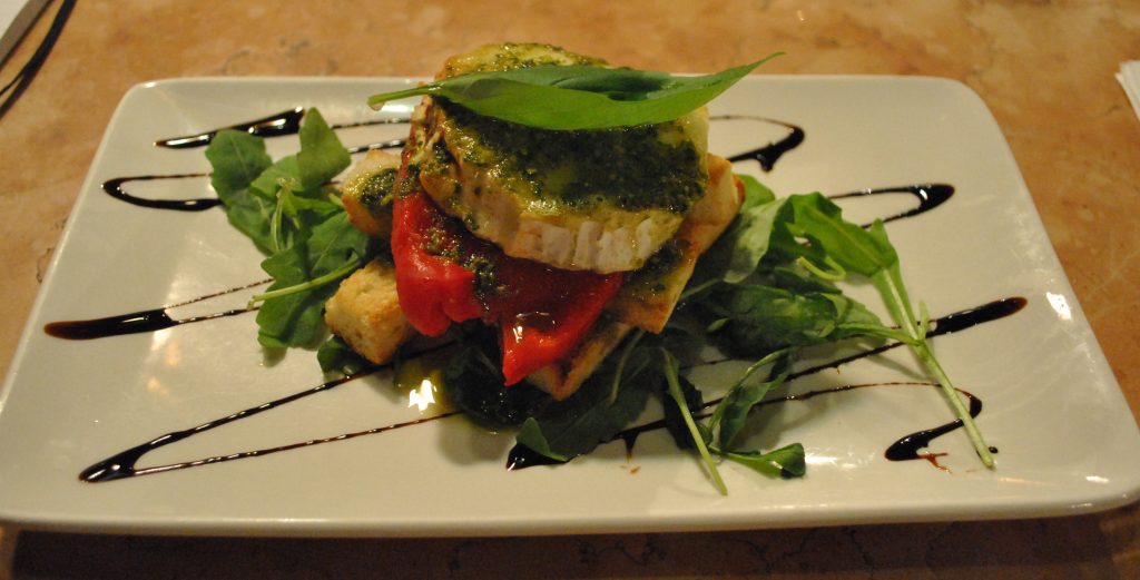 The goats cheese came splashed with the obligatory artful balsamic drizzle and lots of basil leaves. A bed of oil enriched grissini (breadsticks) bear little resemblance to the dry batons one typically expects and give body for the cheese and pepper.